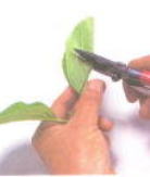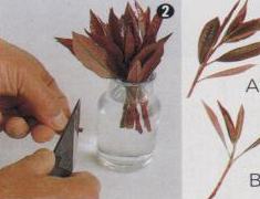 Aは採取した穂木。Bのように 下葉2〜3枚を取り,茎を両面 からナイフでくさび形に 切り戻し,1時間吸水させる |