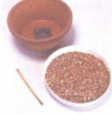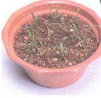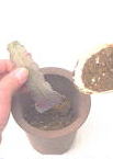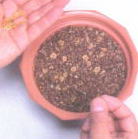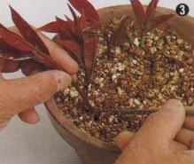 赤玉土に挿し穂を 並べて挿す。 新芽が伸びて葉が 1〜2枚見えたら、株を 堀上げて、鉢に植え替え |