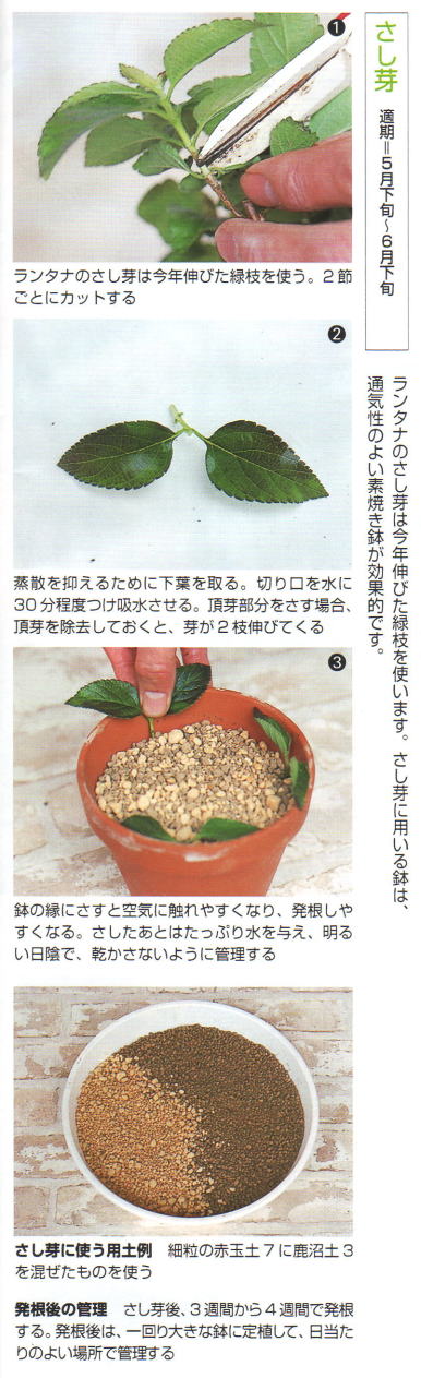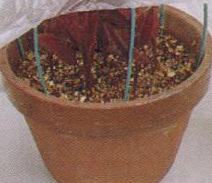 | 仕立て直し・・挿し木・・・・6〜9月いつでも出来ます。挿し木後は戸外の 50〜60%ぐらい遮光下で 十分温度のある場所に置きます。 水やりは発根まで乾かさないように注意します。 |