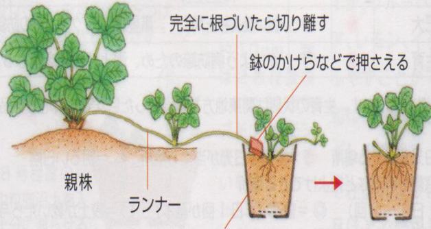 今回紹介する方法は、簡単で失敗の少ないポット育苗です。 収穫が始まると、やがてランナーが伸び始め、子株ができま
