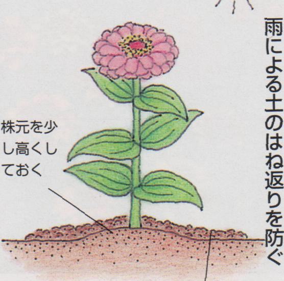 雨による土のはね返りを防ぐ 斑点細菌病は降雨で土がはね返ると、葉や花によく発生します。