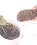 | 発泡スチロールの箱に砂を入れ、鉢を植え 込みます。涼しい縁の下などに置き、 徐徐に乾かします。 急に葉が黄色になり枯れ、休眠に はいります。 |
